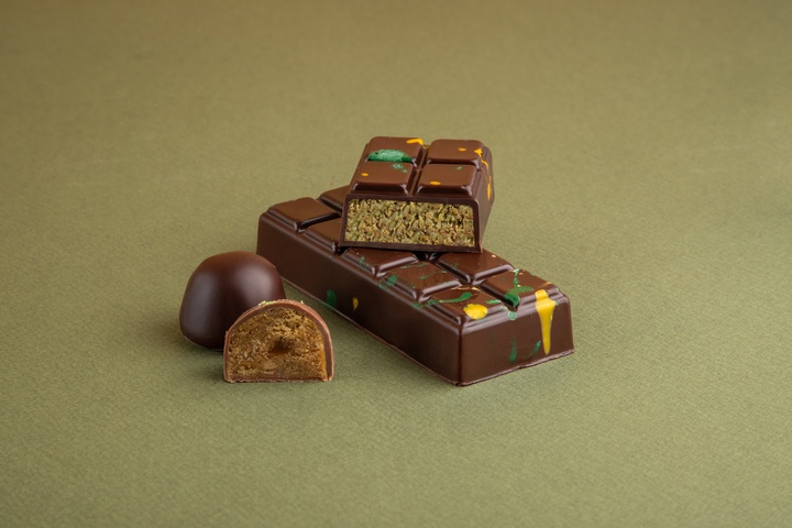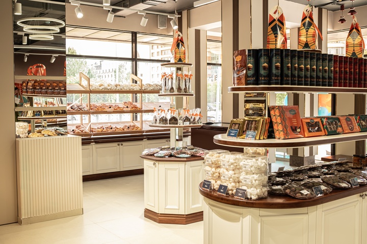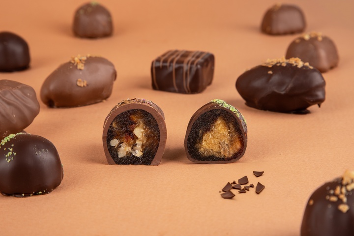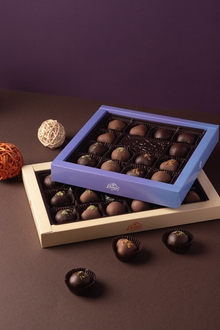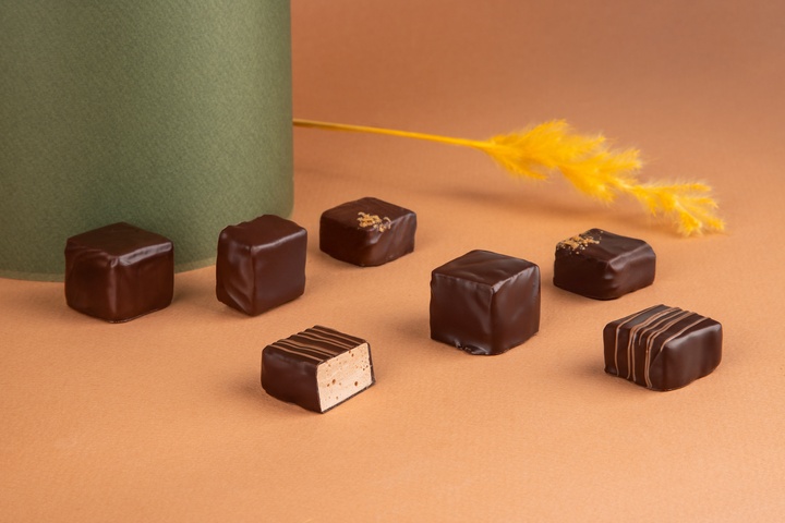 Талқан, шоколад және таңқурай қосылған нәзік ассорти суфлесі — қара шоколадпен қапталған[Ассорти воздушного классического суфле и суфле со вкусами талкана, малины и шоколада, глазированное премиальным бельгийским темным шоколадом]